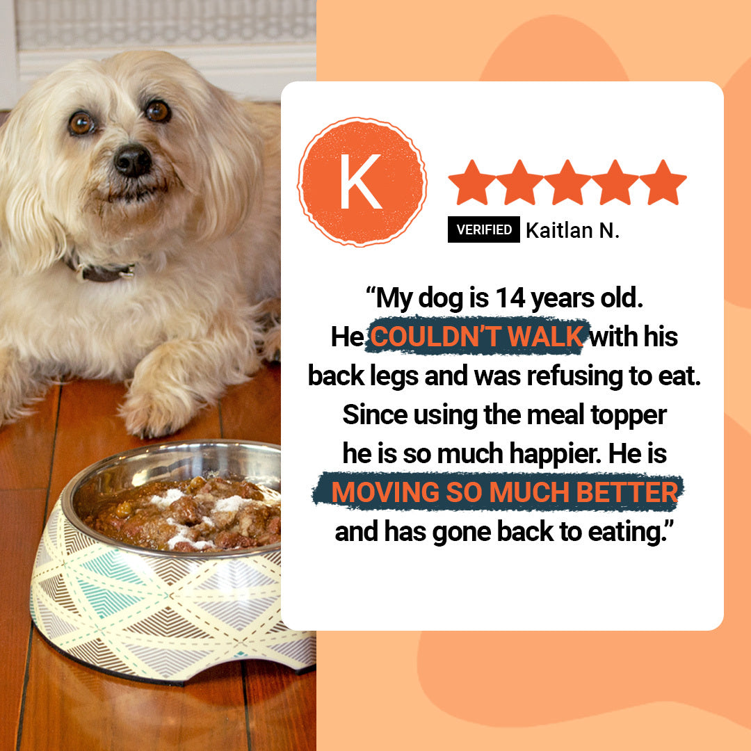 Our Hip & Joint Meal Topper is made with MightyPro™ Glucosamine, specially formulated to help maintain optimal joint health and support mobility in dogs.