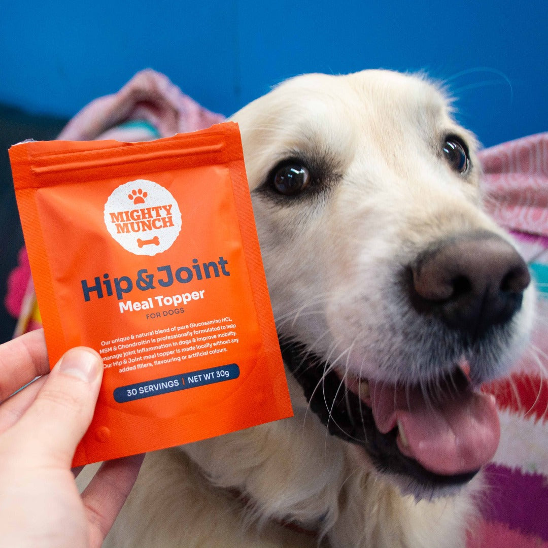 Mighty Munch has developed a break-through science-based formula that eliminates the hassle of pills and tablets for joint support. It is a delicious meal-topper that will have great results on your dog's joint mobility.