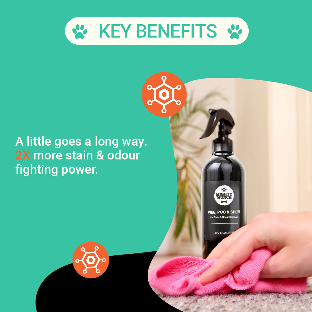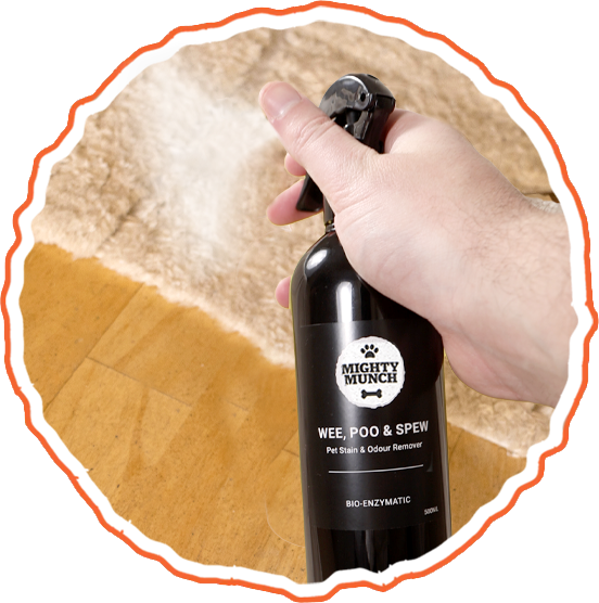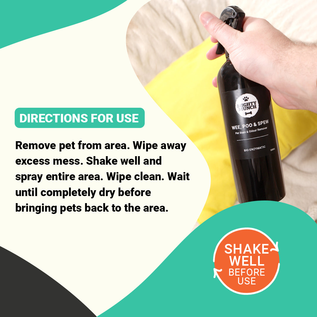 A wee in the house is not just a matter of wiping it dry. It leaves a scented guide so that your dog will return to that spot to pee again. That’s why it’s important to neutralise urine odours. Our spray helps eliminate the smell and remove the stain, but also easily trains your dog. Mighty Munch Pet Stain Remover has been specifically formulated to remove pet odours & stains that regular cleaners can't.